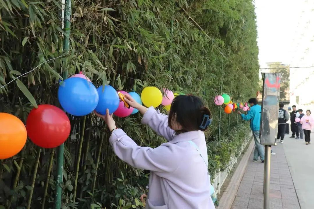 扎气球活动。同学们集中注意力用小刀划开气球,收获美好的祝福。整个活动现场气氛轻松活跃、热闹非凡,随着砰砰的气球爆炸声,不断有同学扎破气球获得相应奖品,引来现场阵阵喝彩。