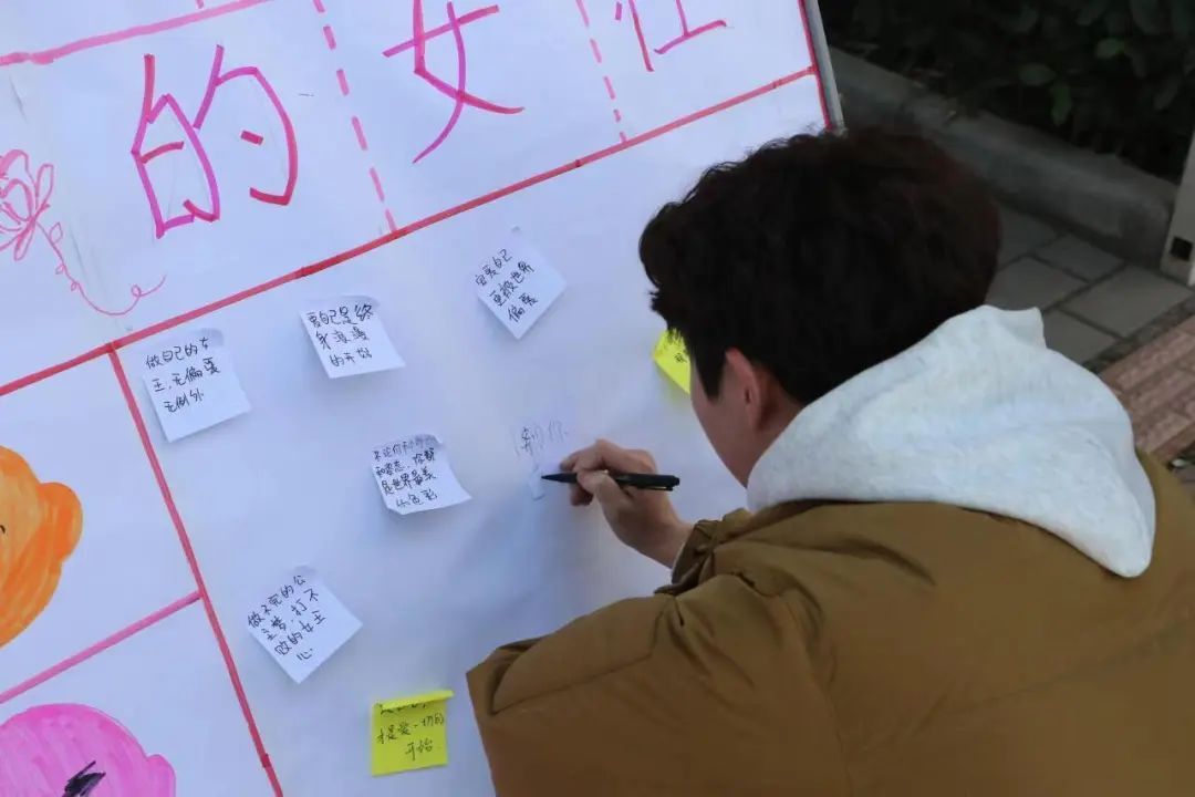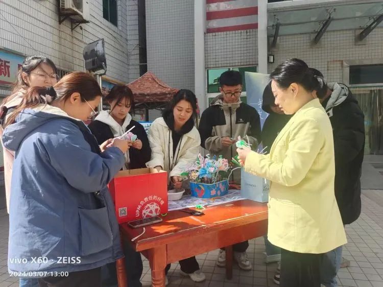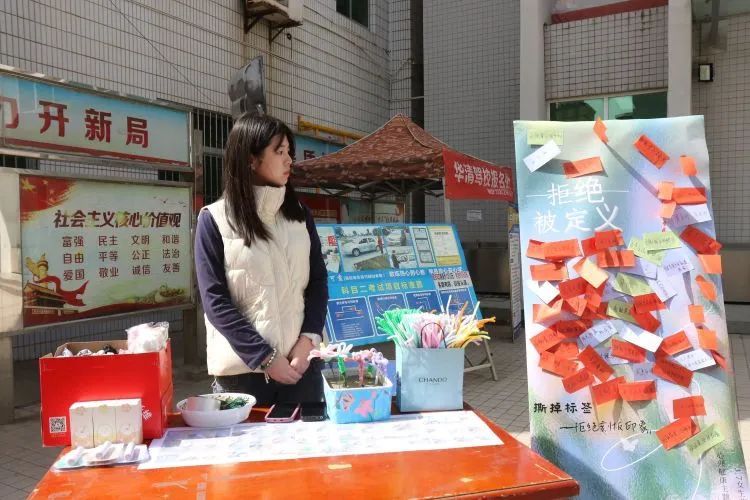 撕标签活动。同学们在撕掉标签的同时也卸下了被强加于自身的枷锁,并制作属于自己的扭扭棒花朵,完成后大家将一朵朵花儿插入花篮中,汇成了所有女生直面未来、直面挫折的坚毅。