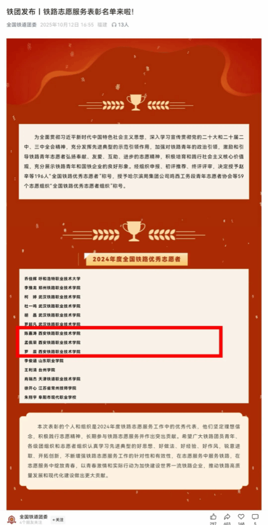 近日,全国铁道团委公布2024年度全国铁路优秀志愿者、优秀志愿者组织及优秀志愿服务项目评选结果,鸭脖学生陈嘉涛、孟佩荣、罗晨被评选为2024年度“全国铁路优秀志愿者”称号。