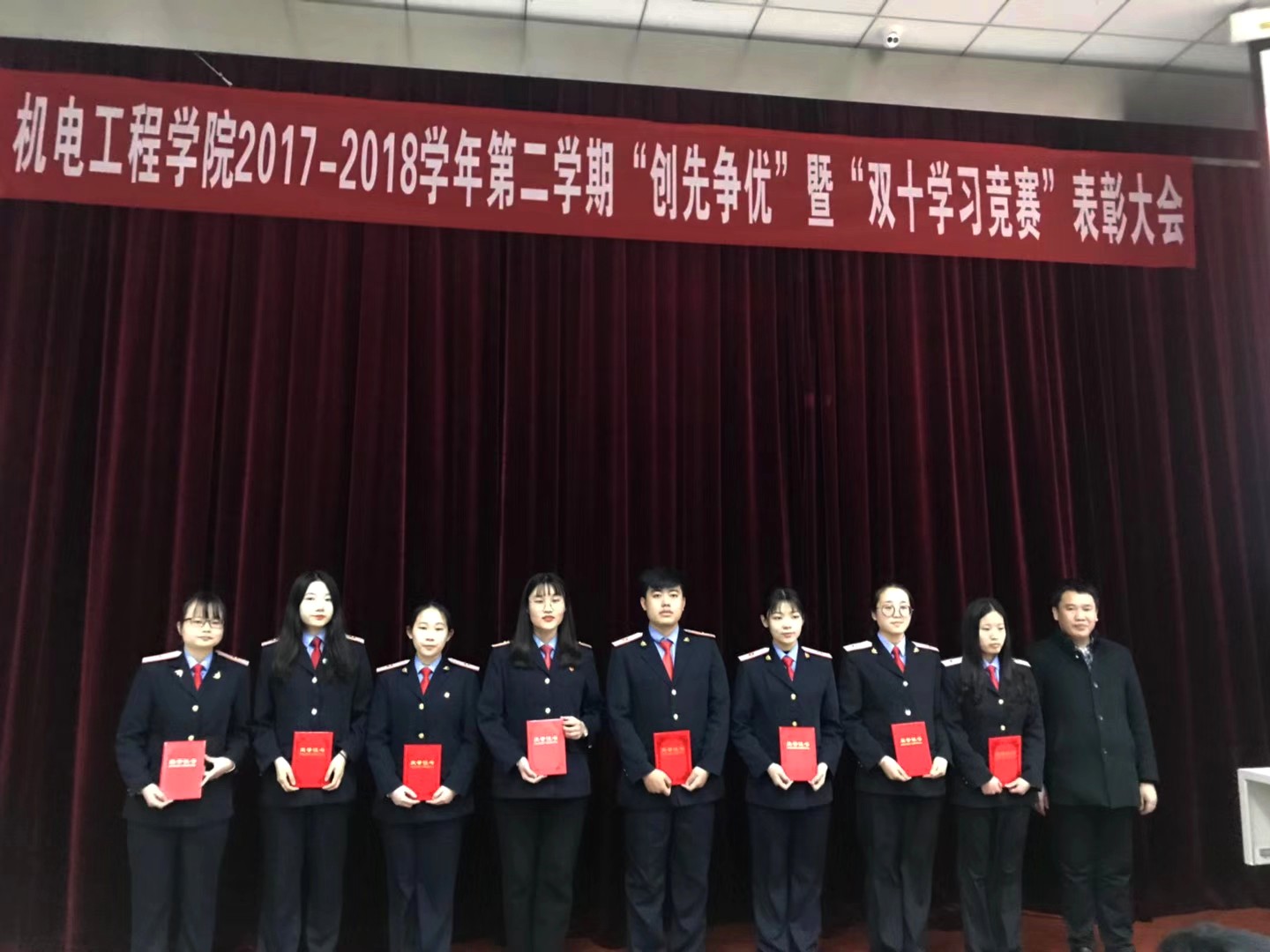 1月3日,机电工程学院举行2017-2018学年第二学期“创先争优”暨“双十学习竞赛”表彰大会。机电工程学院党总支书记张雅兰、院长代礼前,办公室主任邵泽宽、学工办主任王晓民、组织员谷茂庆及全体辅导员、班主任老师和各班优秀学生代表参加本次活动。大会由辅导员田婵媛老师主持。