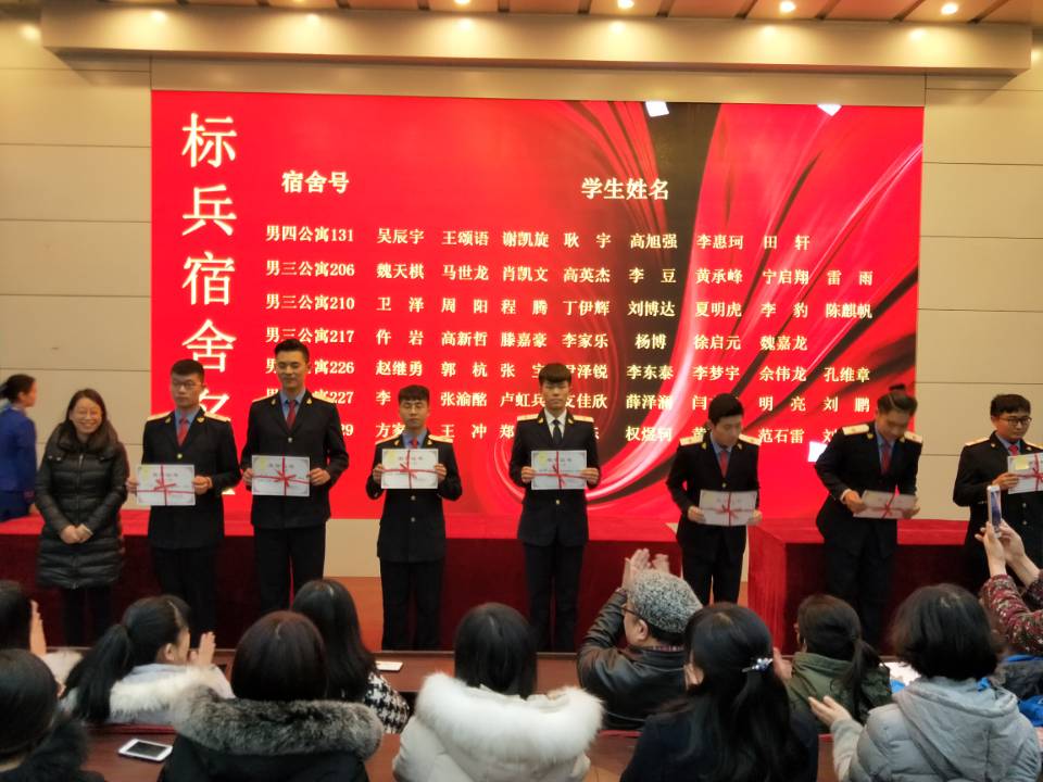 在庄严的院歌声中,大会正式拉开帷幕。班主任孙颖宣读准军事化宿舍表彰名单,辅导员周海龙,侯宝玲、陈刚、姬霞分别为获得标兵宿舍的四组学生代表颁奖,包括31间准军事化标兵宿舍和216名内务标兵受到表彰。