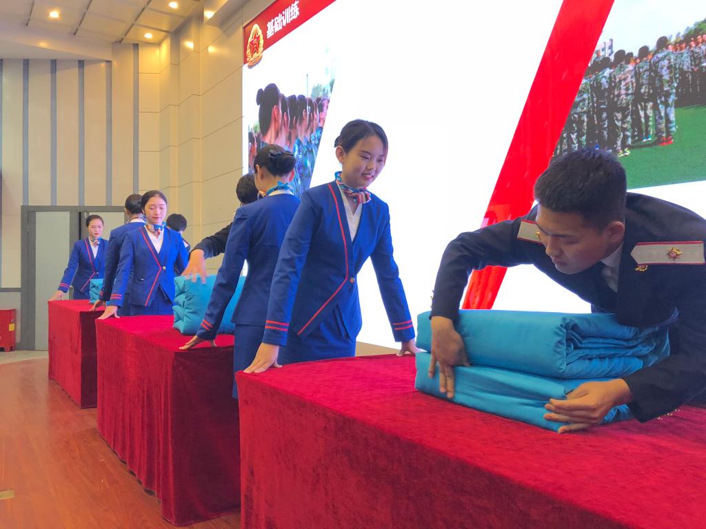 大会展示准军事化成果。伴随着包含军训成果及内务大赛场景的幻灯片回顾,9名学生代表现场分组进行了叠“豆腐块”展示。随着有棱有角的“豆腐块”逐步形成,现场气氛不断高涨,精彩的展示赢得了观众们热烈的掌声。吴宗彬同学作为“内务标兵”代表、吴佳艳同学作为学习代表进行了发言。两位同学站在不同的角度分别对全场同学进行了号召。