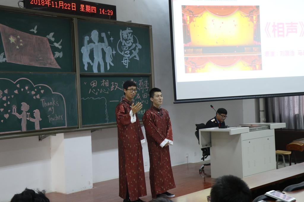 同学们通过朗诵、独唱、歌曲串烧、曲乐表演、情景剧、相声等丰富多彩的形式,表达了他们对感恩的理解。期间,在文艺表演和穿插的击鼓传花游戏中,老师和同学们分享着各自的感恩故事,诠释了他们感恩国家、家人、老师和朋友的真挚情感。