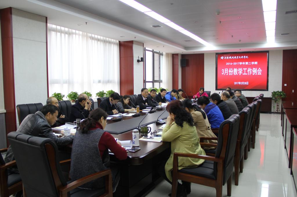 教务处处长滕勇首先传达学习了《陕西省教育厅关于进一步加强高校学生实习工作的意见》(陕教[2017]10号)文件精神,进一步明确了学校加强毕业生实习管理工作的具体要求。寒假期间,教务处会同各系部主要完成了全国交通运输类示范专业点申报,参与学院“追赶超越”目标研讨,成功申办了陕西省“VR(虚拟现实)设计与制作”技能大赛赛项,完成学院、陕西省质量年报,大力推进教师“企业挂职锻炼”,计划编印教师挂职锻炼成果论文集,全力保障学生实习工作等工作。教务处将会同系部做好2017年教改项目申报;出台在线通识课管理办法,通识教育课程开课;深化双创教育,现代学徒制、学年学分制制度,二级学院发挥创新创业能动性,修订2017级人才培养方案等3月份重点工作。各教学部门汇报了学生实习、备战技能大赛,招生宣传、报名等寒假重点工作。
