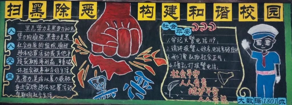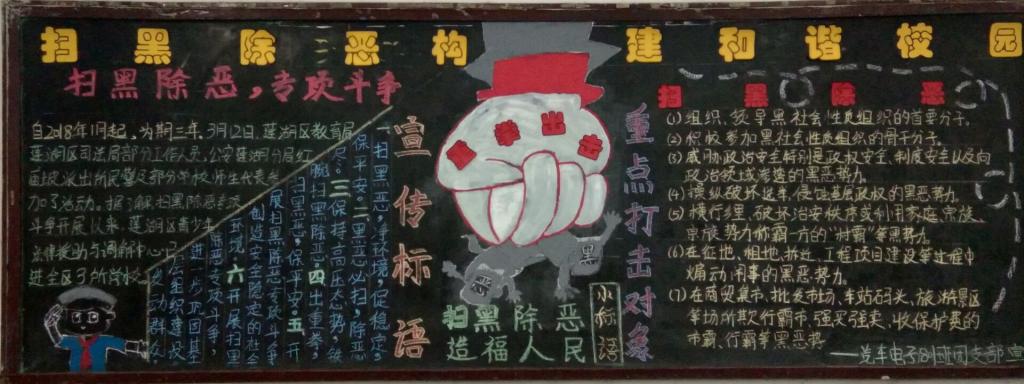 扫黑除恶,功在当代,利在千秋,为了共建平安校园,严防黑恶势力在学校内的产生,进一步号召全体师生积极了解并参与到“扫黑除恶”的专项行动中,电子信息学院团支部开展了以“扫黑除恶,共建和谐校园”为主题的黑板报评选活动,经过同学们的不懈努力,各班级团支部黑板报已圆满完成并踊现出众多优秀作品。