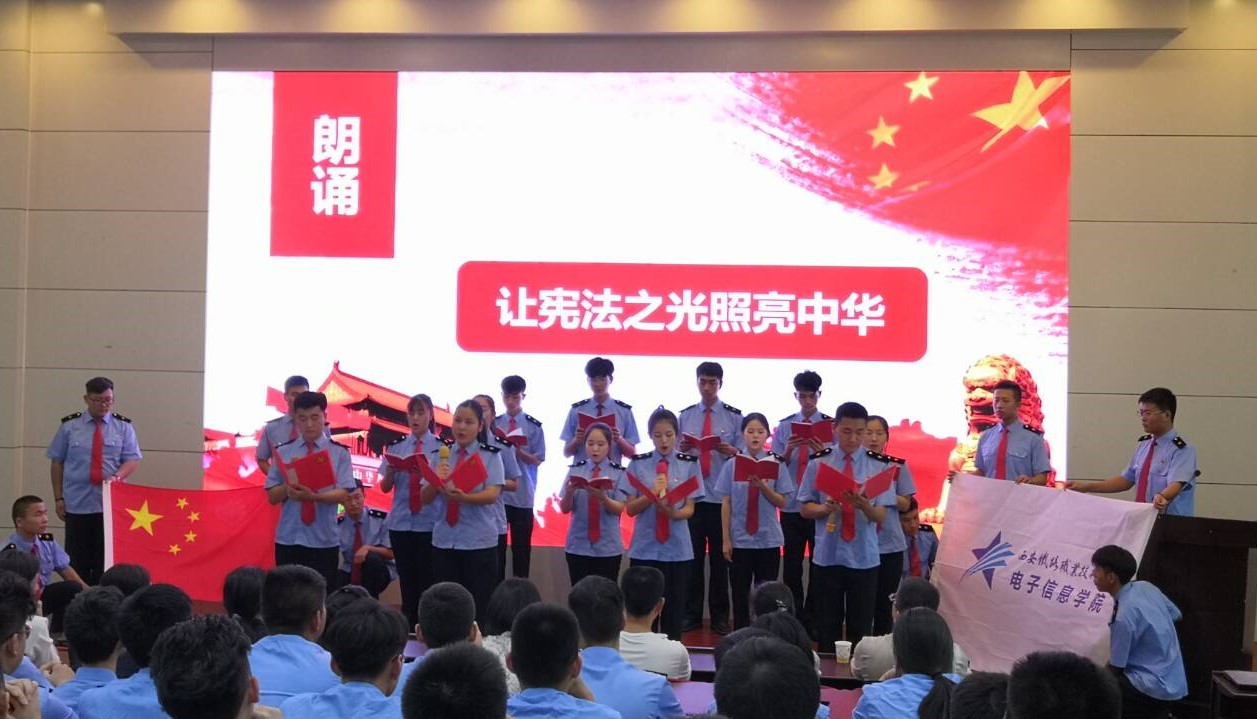 随后,由潘宁、李鑫等11名同学带来朗诵《让宪法之光照亮中华》,充满激情的诗歌朗诵,传达着致敬宪法精神与共筑中国梦的愿望,展现着对宪法权威的尊重和对法治中国日渐完善的自豪。
