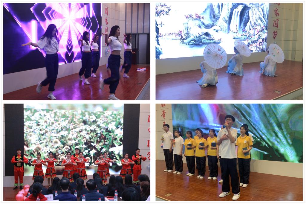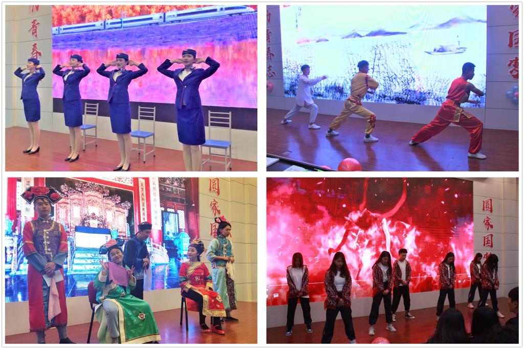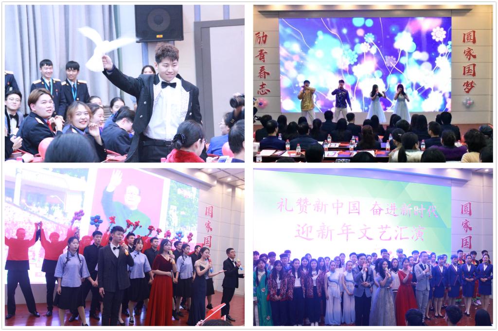 在总结大会结束后,学生演员们将一台集歌曲、小品、魔术、舞蹈、朗诵为一体的精彩迎新年文艺演出呈现给在场师生。舞蹈社同学演绎了热情洋溢、活力四射的开场舞《青春跃起来》;城轨运营1805班的同学表演了充满民族特色的手语操《红山果》,用手指展示了心灵的语言,观众们在手语中感受到了温暖与爱;冯韵文等三名同学的武术表演《中国功夫》行云流水、虎步生风;古典舞《风筝误》的表演可谓舞姿妙曼、衣袂飘飘,让现场观众回味悠长;热情洋溢的《歌曲串烧》点燃了现场的气氛;喜剧小品《后宫甄嬛传》让观众忍俊不禁开怀大笑;诗朗诵《相信未来》带给大家前行的动力和勇气;魔术表演《飞鸽传书》现场变出鸽子,让在场观众大饱眼福,无不惊叹魔术神奇的力量;《礼仪展示》表演尽显鸭脖高铁乘务专业学生的仪态美;最后由学生干部代表表演的情景朗诵《不忘初心》,更是掀起整场汇演的高潮,他们激情澎湃、 声情并茂,讴歌新中国成立70周年的光辉历程,赞美70年来国家取得的辉煌成就。整场演出气氛热烈欢快,节目精彩纷呈,在观众们经久不息的掌声中圆满落幕。