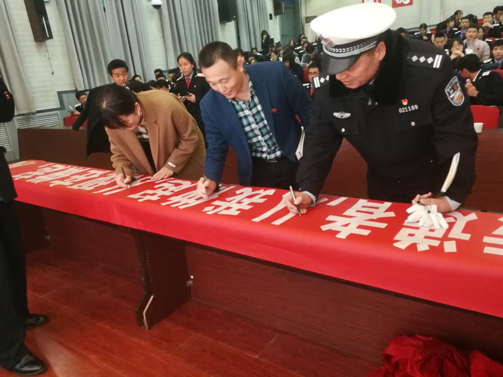 随后针对交通安全问题,到场警官向同学们现场提问,并逐一解答,更加深了安全规范在同学们心中的重要性。活动现场,王波和张治平共同为2019级志愿者服务队进行了授旗仪式,现场还播放了学校“交通文明服务队”的视频专辑,志愿代表张宇也作了表态发言。活动最后,全体参会人员共同在“做安全的践行者,做文明的传递者,从我做起,从现在做起,从细节做起”的横幅上签字,共同倡导安全文明出行。