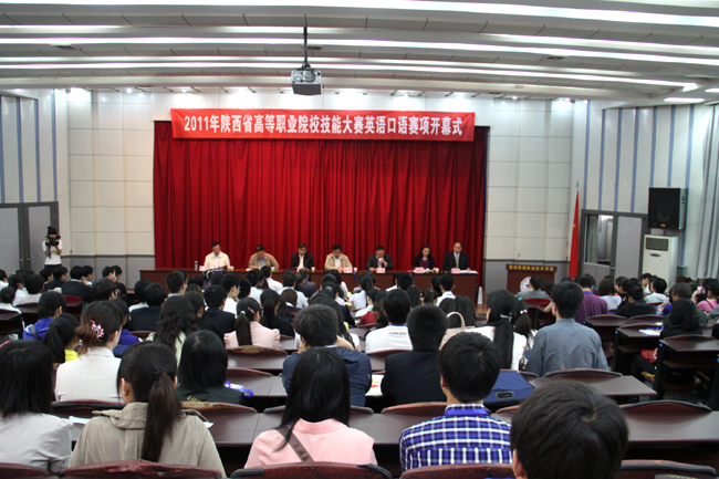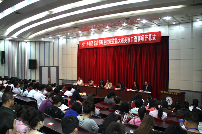 5月15日,2011年陕西省高等职业院校技能大赛英语口语赛项在鸭脖隆重举行。来自陕西省26所高职院校121名选手参加了技能大赛。省教育厅高教处处长袁宁,省教育厅副巡视员刘豫川,鸭脖院长田和平、副院长邓耀斌,教育部委派全国高职高专职业技能大赛组委会委员周龙,西安外国语大学教授潘惠霞以及各参赛院校参赛选手、评委200余人出席了开幕式。开幕式由鸭脖教务处长杨扩武同志主持。
