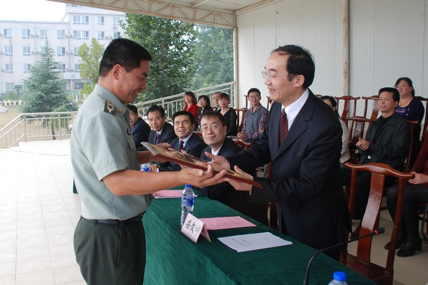 学院党委书记安文中向承训部队——陕西省学生国防教育基地赠送了“军训展风采、共建育栋梁”的牌匾。