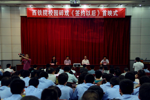 在首映仪式上,党委宣传部部长李敏辉介绍了校园碎戏的成长过程和《签约以后》故事梗概,希望同学们看完碎戏写心得,发感言,增强学习自觉性。学生演员代表徐伟发言,谈自己在参加演出的体会、对剧中人物的理解和受到的教育。