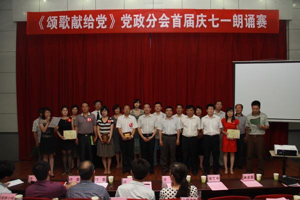 为隆重纪念中国共产党建党91周年,丰富教职工的业余文化生活,在机关后勤党总支的关心指导下,党政分会于6月26日下午举办了“颂歌献给党庆七一”首届教职工朗诵赛。院党委书记安文中,党委副书记、纪委书记黄家昌观看了比赛并为获奖选手颁发获奖证书及奖品。党政分会全体教职工、应邀的部分分会主席和学生代表200余人参加了活动。