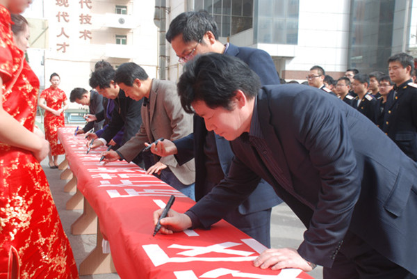3月6日下午,龙首校区全体学生举行了“美丽yabo鸭脖官网 文明伴我行文明礼貌卫生活动月启动仪式暨厉行勤俭节约反对铺张浪费”的签名活动。校区主任吴领合、党总支书记郭小莉、副主任孙明魁、马建萍、学院思政部主任景延鹏、学院继续教育学院院长司西平、副院长许晓华、学工办主任高阿联和全体辅导员班主任参加了活动。活动由校区团委书记李妮主持。