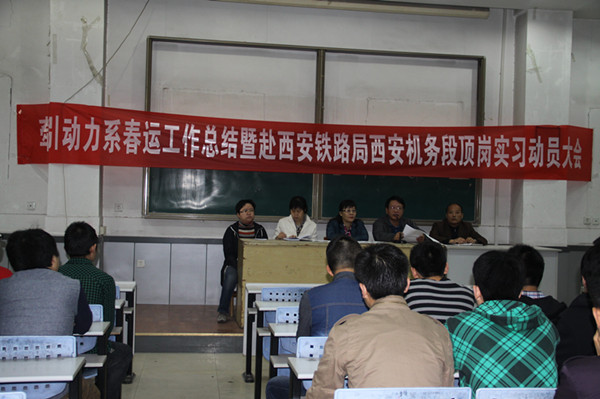 3月21日上午,牵引动力系春运工作总结暨赴西安铁路局西安机务段顶岗实习动员大会在在三楼自习室召开。牵引动力系主任李益民、党总支书记和晋秦、系办公室副主任丁洪芬、机车教研室主任崔晶参加动员大会,会议由系学工办主任王智敏主持。