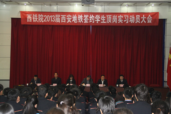 3月22日,“yabo鸭脖官网2013届西安地铁签约学生顶岗实习动员大会”在学院召开,拉开了270名“地铁准员工”到岗履新的序幕。根据实习安排,首批60名“准地铁司机”已于27日赴岗参加培训。其余岗位的培训工作从4月3日陆续开始。