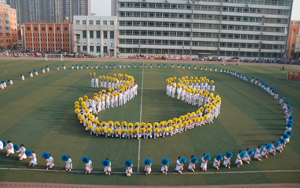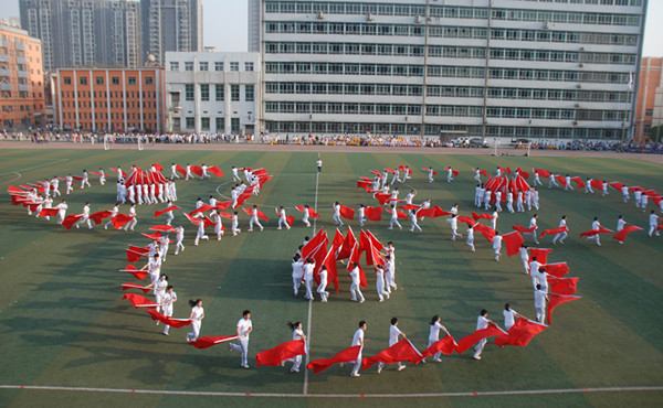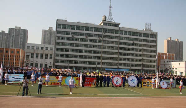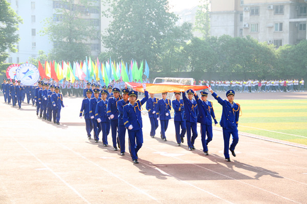 在开幕式入场式上,伴随着激情澎湃的《运动员进行曲》,旗手们庄严地护卫着国旗进场,紧随其后的是校旗护卫队,接着运动会会徽、