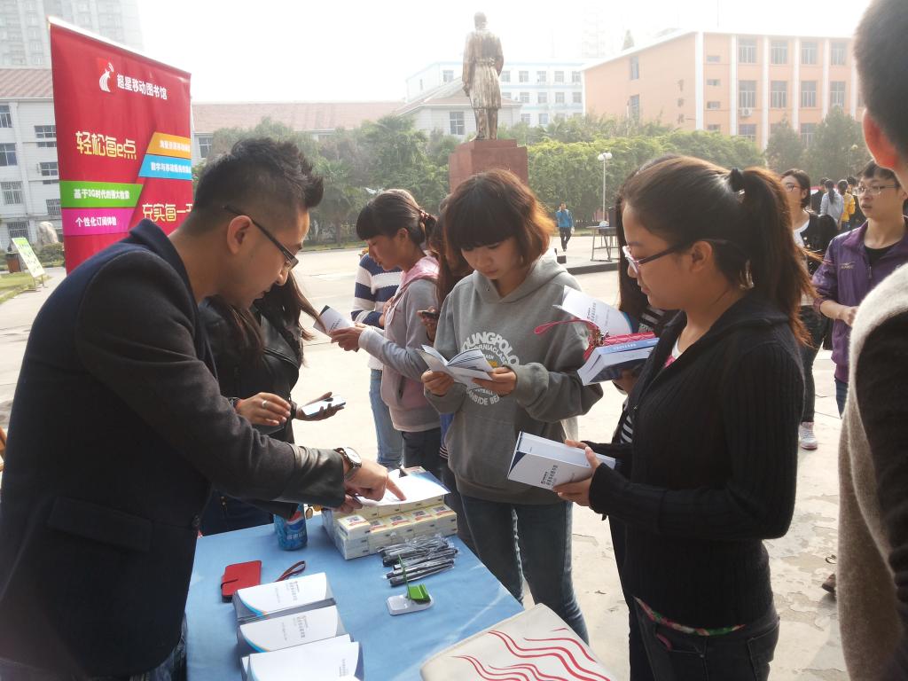 为了让更多的人了解“手机移动图书馆”,10月17日下午,图书馆邀请超星公司工作人员,在詹天佑广场举办了“超星手机移动图书馆”读者体验活动。