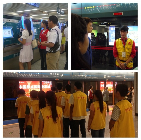 伴随着地铁一号线的正式开通,9月15日,西安地铁二号线志愿服务工作也正式开始,鸭脖青年志愿者主要分布在二号线北客站、钟楼、小寨、会展中心、北大街五个客流量密集的站点,主要服务内容为介绍地铁运营时间和路线,帮助乘客自助购票,引导乘客进、出站,引导换乘等志愿服务。除此之外,志愿者们还学习了进出站闸机的一般故障的维修方法,对出现故障的闸机能够第一时间尽力解决问题,既帮助地铁工作人员减轻了工作量,也使乘客可以快速的通过,同时作为铁路专业的学生也能够立足行业特色,学以致用。