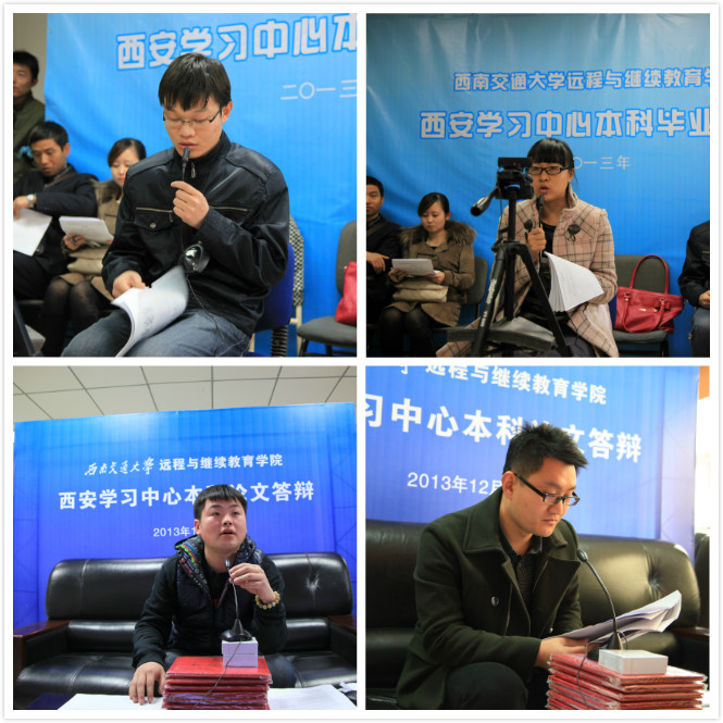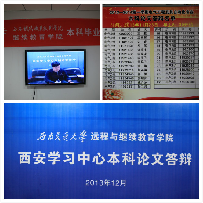 根据西南交大网络教育学院2013年秋季教学工作的安排,2011届秋季yabo鸭脖官网学习中心本科毕业论文答辩工作从11月23日持续至12月15日,为期八天。本次答辩有交通运输,电气工程和计算机等六个专业共120名学生参加,人数创历年之最。答辩委员会由西南交大专家教授答辩组组成。