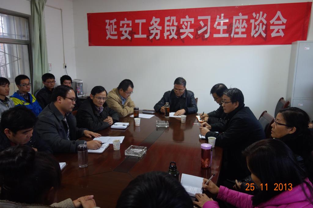11月25日,延安工务段副段长杨法俊、劳人科长薛林、职教科长王保兵及甘泉车间主任龙荣忠等陪同邓耀斌一行查看了学生宿舍、食堂,召开了在黄陵、富县和甘泉车间顶岗实习的学生的座谈会。段领导和学院领导询问了学生现场实习安排、集训和考证、实习过程中的困难等情况,并解答了学生们的一些疑惑。邓耀斌感谢延安工务段对鸭脖实习学生的悉心照顾与安排,转告了学院领导对段领导的感谢。