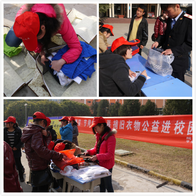 为深入贯彻党的十八大精神,践行“奉献、友爱、互助、进步”的志愿者精神,同时鼓励学院广大青年学生热爱公益、奉献爱心。根据西安市教育局《关于开展“中国梦 教育情 公益行”之“衣旧情深 节用惜福”募捐旧衣物公益进校园活动的通知》精神, 12月4日下午,学院青年志愿者协会携手红十字协会在詹天佑广场正式开展“衣旧情深 节用惜福”捐衣活动。