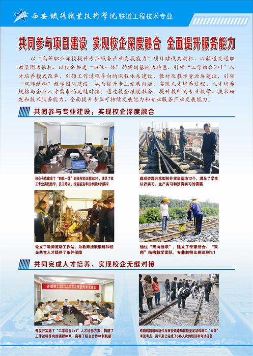 该项目于2011年12月正式立项。两年来,铁道工程技术专业建设团队在学院建设项目领导小组的领导下,严格遵照中央财政支持项目铁道工程技术专业建设方案,以科学发展观为统领,紧密结合行业和区域经济发展需求,通过校企共同完善合作运行机制、共同参与师资队伍建设、共同参与校内外实训基地建设、共同参与人才培养方案和课程标准修订工作、共同参与教学资源库建设、共同参与人才培养质量评价工作,实现了学校与企业的深度融合、实现了人才培养的无缝对接,实现了专业建设的内涵式发展,提升了专业服务产业发展的能力。