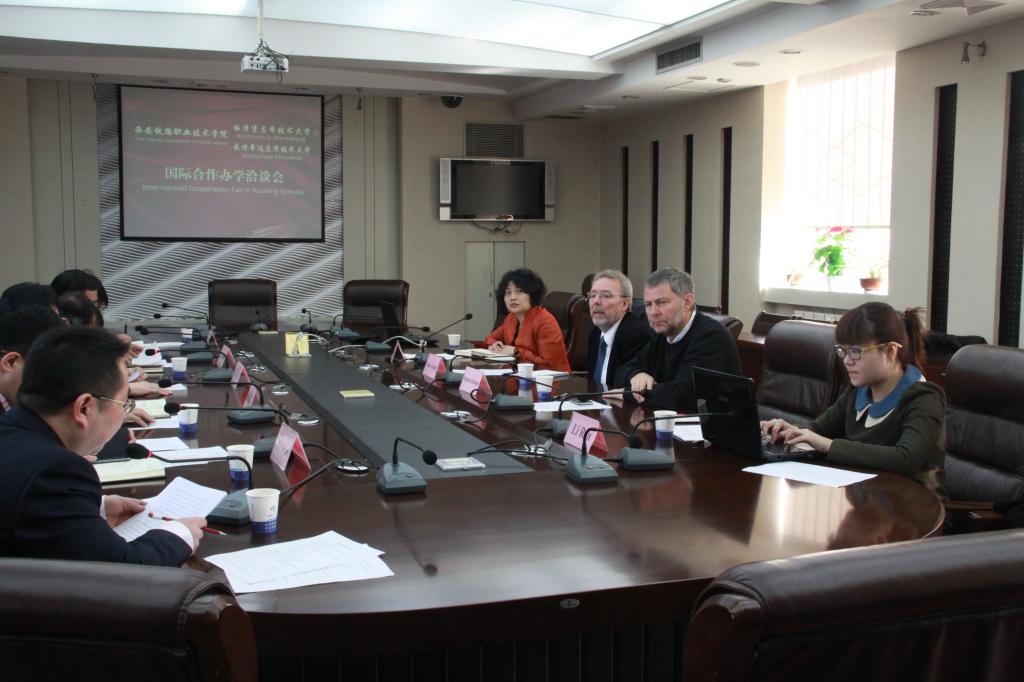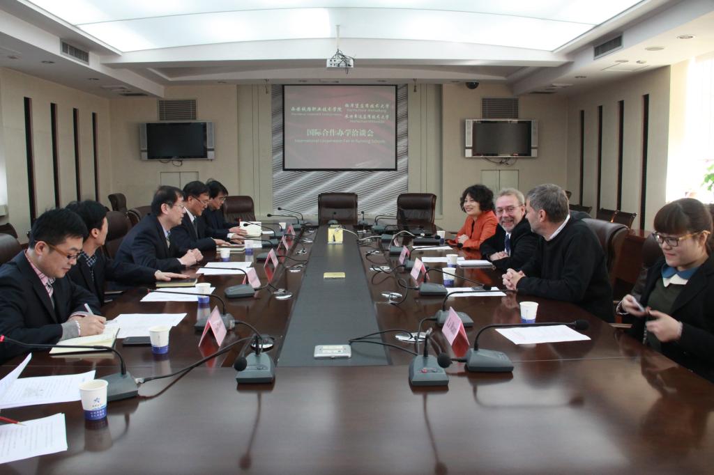 通过省教育厅国际合作与交流处孙建宁处长的引荐和前期沟通,该两校代表专程来鸭脖,就联合办学事宜进行洽谈和磋商。经过两个多小时的充分交流与沟通,双方就实施“3+2”合作模式和选择合作专业的可行性达成共识。并就国际合作办学有关政策进行了交流。
