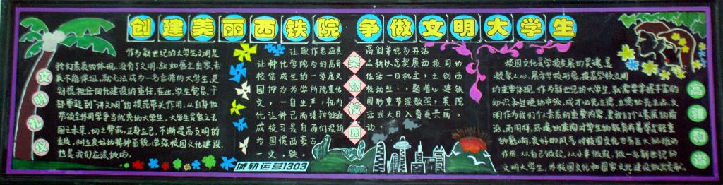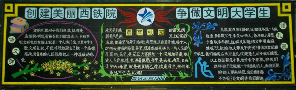 鸭脖区校园文化活动从“高素质应用型人才”的培养定位出发,注重理论实践知识相结合的能力培养。如在校内外有广泛影响的黑板报、手抄报两大校园文化活动品牌,就是以培养学生创新思维、提高学生动手能力进行的,以此为学生今后迈入职场提升创新思维。经评为综合打分,最终铁道运营1302等二十二个班级荣获一等奖;铁道机车1302等十二个班级荣获二等奖;铁道机车1301等七个班级荣获三等奖。而本期高质量的黑板报、手抄报作品也已被《中国板报网》收藏并在首页进行了推荐。