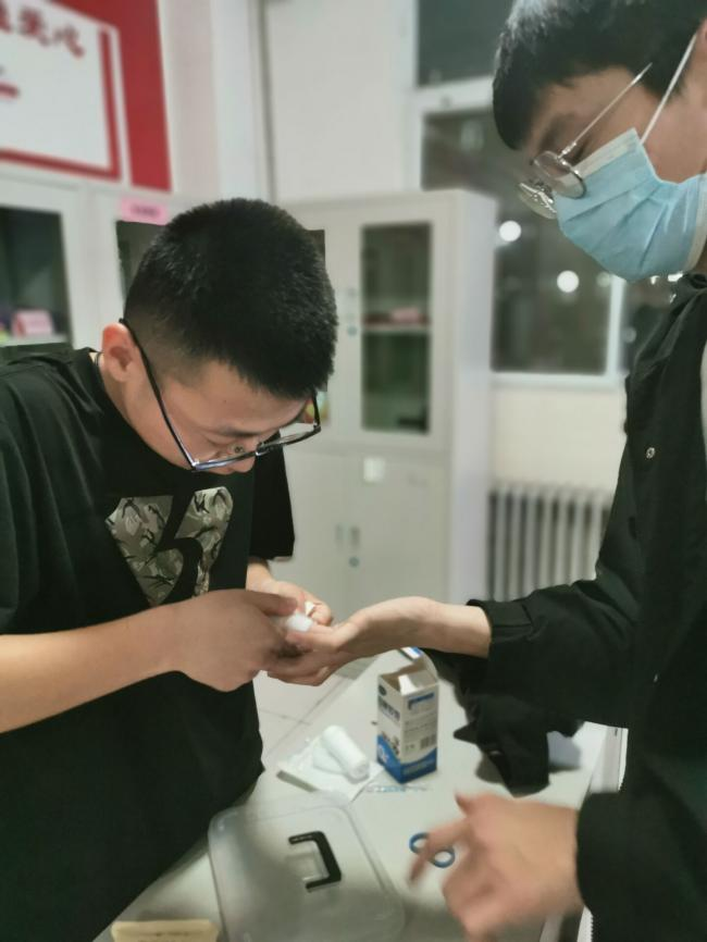 图1 爱心驿站张鑫正在为受伤同学处理包扎伤口